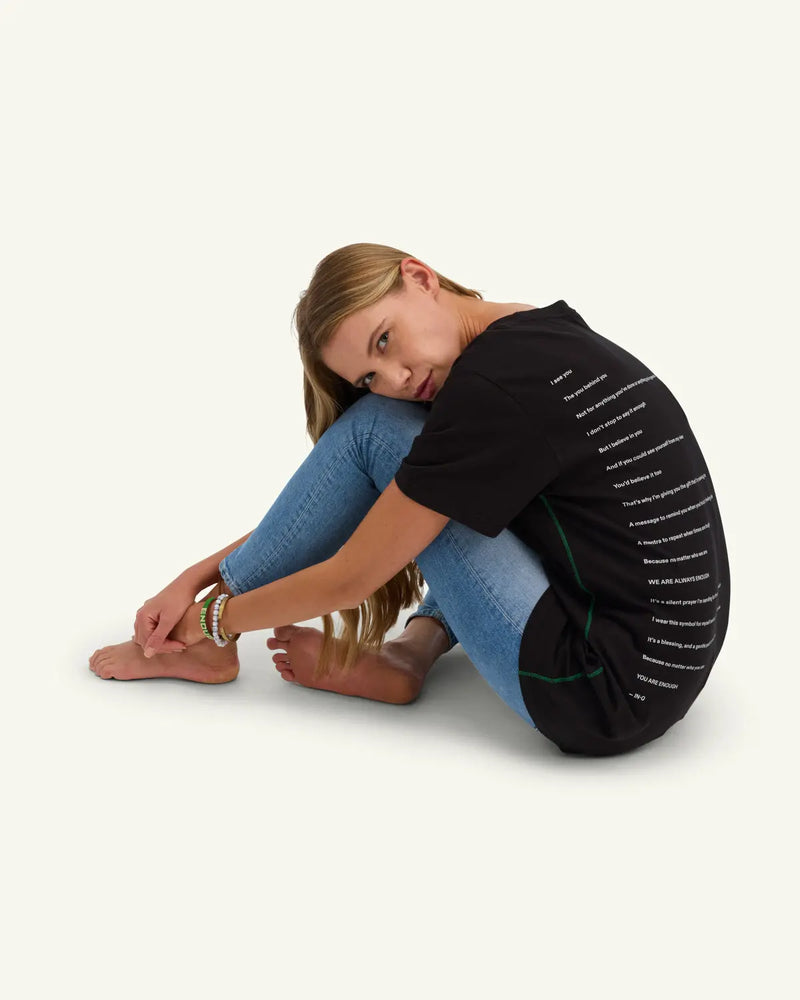 Designed to bring you back to what matters, the Centered Logo Tee balances comfort with intention. Made from soft 100% cotton with contrast side-stitching and a special poem on the back for anyone who needs it.