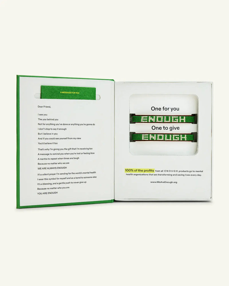 Our ENOUGH bracelets are purposely sold in pairs because the act of giving one to another person helps create a connection that makes both people feel more seen and whole. It’s also how we spread the message to more people.
