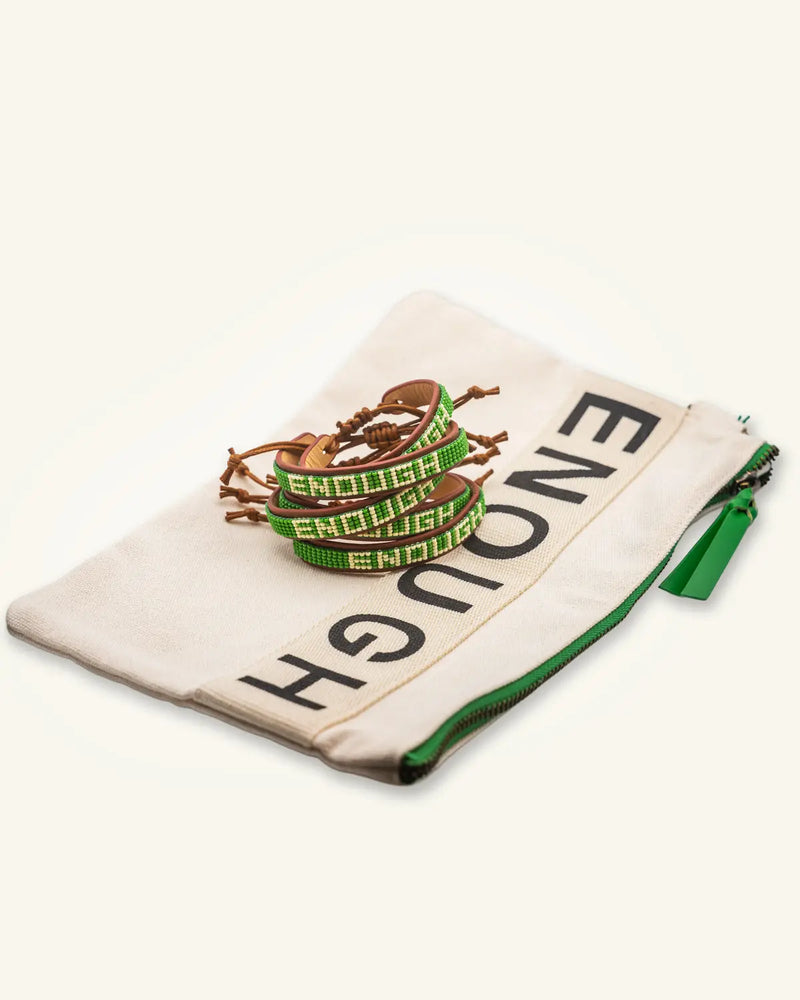 Made for sharing, this multi-pack of ENOUGH Bracelets makes it easy to spread the reminder wherever you go. Each set includes 5 handcrafted beaded leather bracelets, thoughtfully gathered in our limited edition Simply ENOUGH canvas pouch, ready to carry and give.
